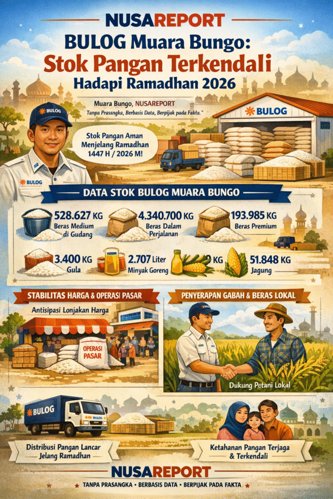 NUSAREPORT – Muara Bungo , Jumat,16/1/2026,- Perum BULOG Kantor Cabang Muara Bungo memastikan ketersediaan stok pangan strategis di Kabupaten Bungo dalam kondisi aman dan terkendali menjelang serta selama bulan suci Ramadhan 1447 Hijriah/2026 Masehi. Kepastian ini menjadi penyangga penting bagi stabilitas pasokan dan harga bahan pokok di tengah meningkatnya kebutuhan masyarakat.