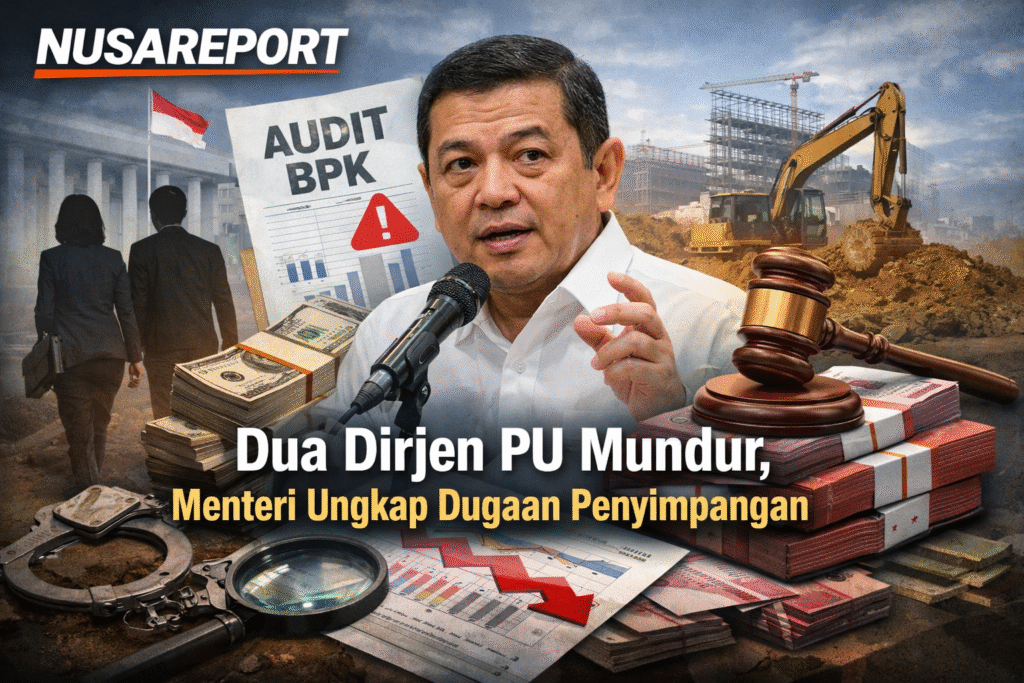 NUSAREPORT-Jakarta, Pengunduran diri dua Direktur Jenderal di Kementerian Pekerjaan Umum (PU) kini mulai menemukan penjelasan setelah Menteri PU Dody Hanggodo membeberkan kronologi yang ia kaitkan dengan dugaan penyimpangan anggaran berdasarkan temuan Badan Pemeriksa Keuangan (BPK). Dua pejabat yang mengundurkan diri itu adalah Dirjen Cipta Karya Dewi Chomistriana dan Dirjen Sumber Daya Air (SDA) Dwi Purwantoro.