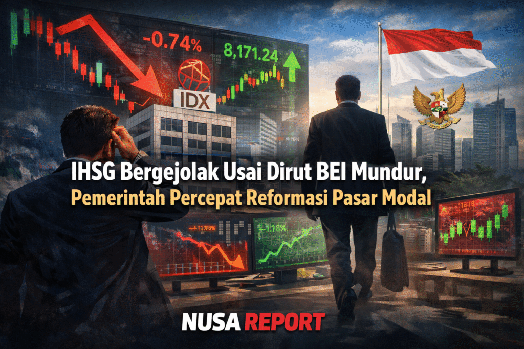 NUSAREPORT-Jakarta, 30/1/2026,- Indeks Harga Saham Gabungan (IHSG) sempat mengalami fluktuasi tajam pada awal perdagangan setelah pengumuman pengunduran diri Direktur Utama Bursa Efek Indonesia (BEI), Iman Rachman. Pasar yang dibuka menguat 1,11% ke level 8.323,20 langsung berbalik melemah dan terkoreksi 0,74% ke posisi 8.171,24 pada pukul 09.33 WIB. Meski demikian, tekanan tersebut tidak berlangsung lama. IHSG berhasil kembali menguat dan menutup sesi I perdagangan di level 8.329,15 atau naik 1,18%.