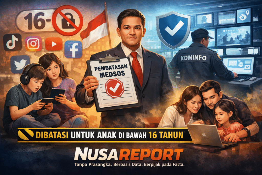 NUSAREPORT- Jakarta, Pemerintah melalui Kementerian Komunikasi dan Digital (Komdigi) resmi membatasi akses media sosial bagi anak di bawah usia 16 tahun. Kebijakan ini akan mulai diterapkan secara serentak pada 28 Maret 2026 sebagai langkah memperkuat perlindungan anak di ruang digital.