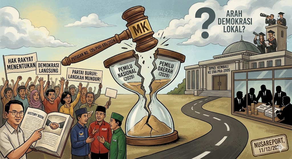 NUSAREPORT- Jambi, 11/12/2025,- Putusan Mahkamah Konstitusi Nomor 135/PUU-XXII/2024 yang memerintahkan pemisahan pemilu nasional dan pemilu daerah mulai 2029 kembali menggerakkan perdebatan lama mengenai mekanisme pemilihan kepala daerah. Setelah putusan itu diketuk, pembahasan tentang efisiensi penyelenggaraan pemilu dan desain ulang sistem politik lokal menguat, termasuk wacana mengembalikan pemilihan gubernur, wali kota, dan bupati kepada DPRD seperti era sebelum 2005.