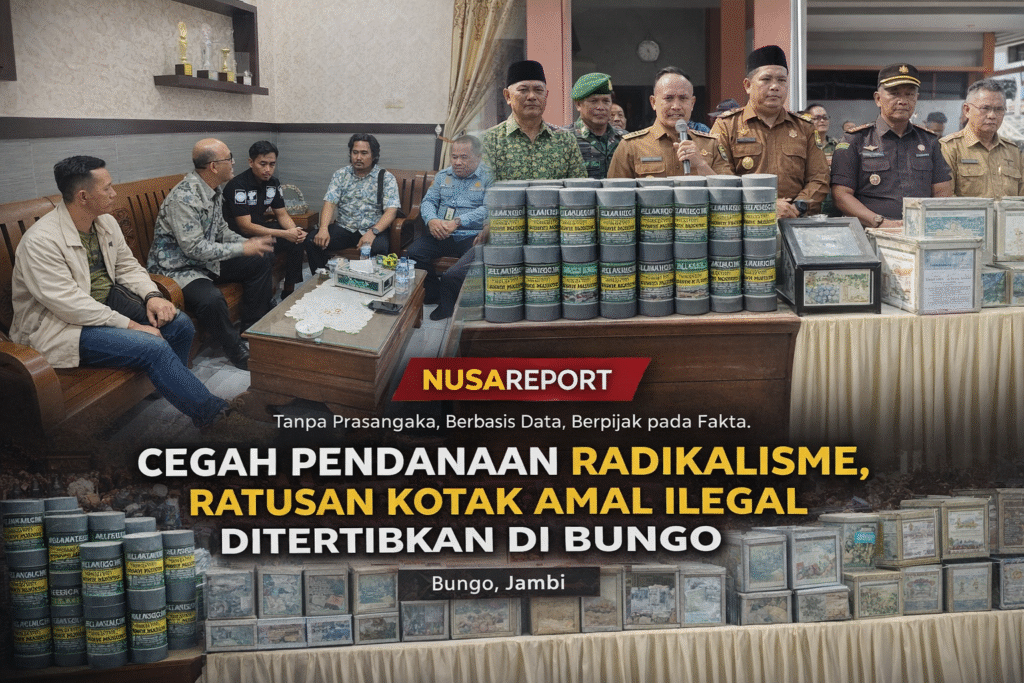 NUSAREPORT- Bungo, Jambi. Langkah Satuan Tugas (Satgas) Penertiban Kotak Amal Pemerintah Kabupaten Bungo menertibkan 302 kotak amal ilegal bukan sekadar operasi penegakan ketertiban umum. Di balik tindakan administratif tersebut, tersimpan upaya strategis untuk menutup celah senyap pendanaan radikalisme yang selama ini bergerak di ruang sosial-keagamaan tanpa banyak disadari publik.