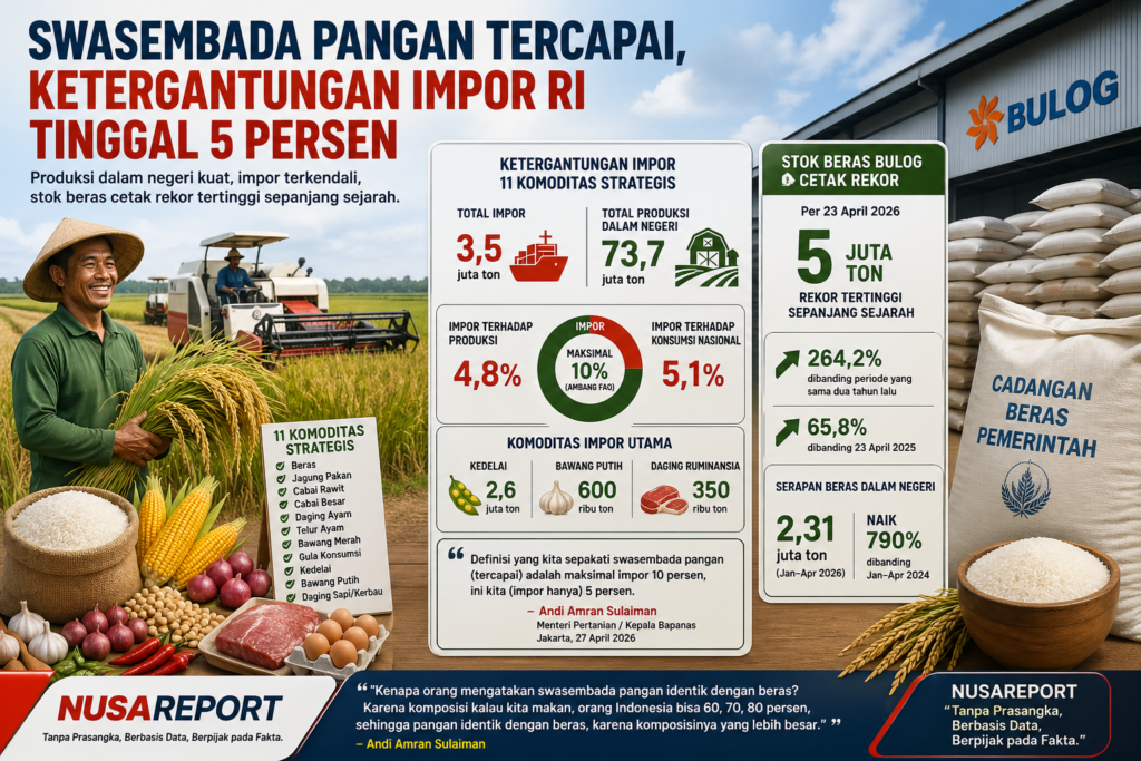 NUSAREPORT- Jakarta, Senin 27 April 2026,- Pemerintah memastikan Indonesia telah mencapai status swasembada pangan dengan tingkat ketergantungan impor yang kini hanya berada di kisaran 5 persen. Capaian ini merujuk pada indikator 11 komoditas strategis nasional yang selama ini menjadi tolok ukur ketahanan pangan.